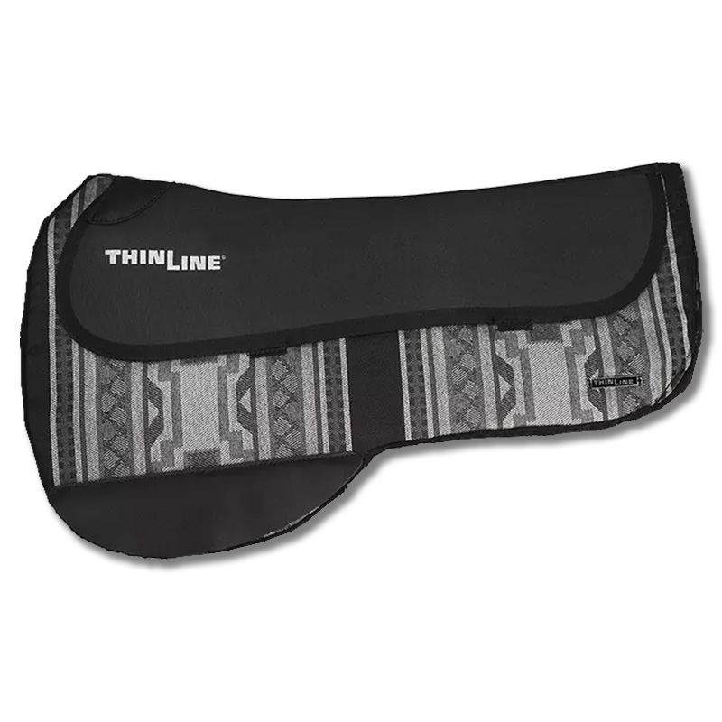 The slim design puts you in closer contact with your horse, so your leg can easily drape giving you a seamless feel of his sides.  You’ll notice his back moving more,  but with the extraordinary shock absorption of ThinLine, you will be moving in unison with your mount.  The ThinLine layer sewn onto the pad has a 95% shock absorption rate that spreads impact LATERALLY  along the pad. The motion you feel under you as you ride is absorbed by the ThinLine and transferred ACROSS the pad instead of UP into your spine. And this same shock absorption benefit is being enjoyed by your horse as well. With the reduced movement of your seat, your balance is easier to keep so “staying” with your horse becomes second nature. You sit quieter, and he responds with a relaxed, soft back, and freer strides.